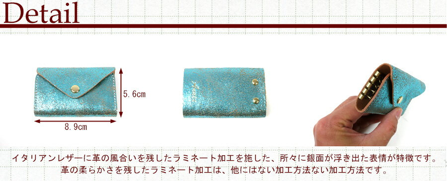 ギフト対応 商品詳細 商品番号 LZKM-800 仕様 ■サイズ(概寸表記) タテ5.6cm×ヨコ8.9cm×厚さ1.7cm ■重さ 36g ■キーリング 4連 カラー 〇シルバー 〇ゴールド 〇ピンク 〇ブルー 〇グリーン 素材 イタリアンレザー(牛革) 特徴 イタリアンレザーに革の風合いを残したラミネート加工を施した、所々に銀面が浮き出た表情が特徴です。