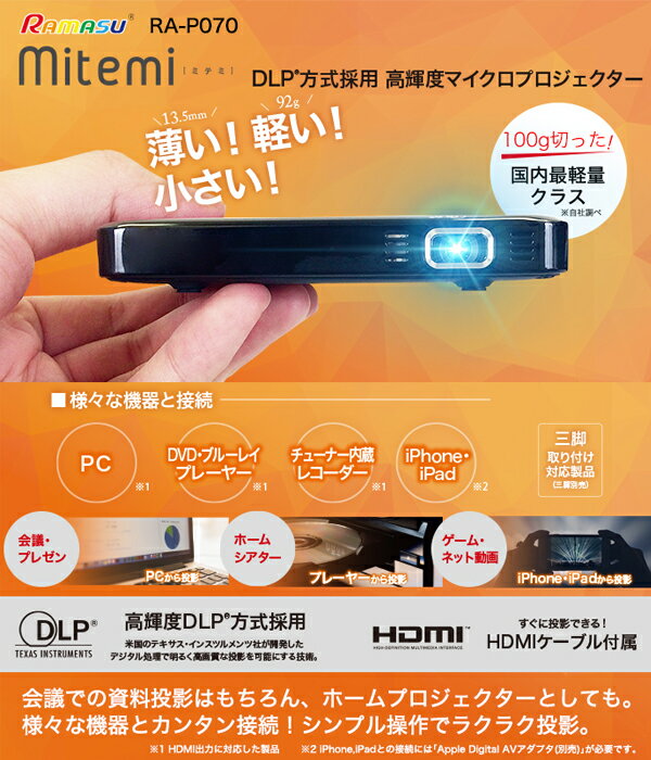 ■在庫のある出荷日について メーカー RAMASU 商品名 mitemi 高輝度マイクロプロジェクター 型番 RA-P070 サイズ(約) 98×H75.5×D13.5mm 重量:92g 投影サイズ 10〜80インチ距離:0.5〜4m 明るさ 63 ANSI ルーメン LED 50W 50000時間 コントラスト 1100:1 フォーカス マニュアル 解像度 640×360 インターフェイス 3.5mmオーディオジャック/HDMIポート/microUSB電源ポート 電源 AC100V 50/60Hz 生産国 中国 主な特徴 ■薄い!軽い!小さい! 100g切った! 国内最軽量クラス (※自社調べ) ■高輝度DLP方式採用 米国のテキサス・インスツルメンツ社が開発したデジタル処理で明るく高画質な投影を可能にする技術 ■HDMIケーブル付属 すぐに投影できるHDMIケーブル付属 ■三脚取付対応製品 ※三脚別売り ■様々な機器とシンプル操作でラクラク投影! 付属品 HDMIケーブル (約65cm) USB/microUSBケーブル (電源用/約45cm) USB電源アダプター 携帯用ポーチ 取扱説明書/保証書 取扱説明書(保証書) メーカー希望小売価格はメーカーサイトに基づいて掲載していますプロジェクター 小型 スマホ 家庭用 DLP 軽量 コンパクト 本体 ホームシアター